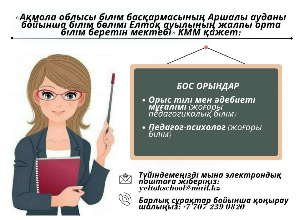 2025 жылғы 15 тамызда "Ақмола облысы білім басқармасының Аршалы ауданы бойынша білім бөлімінің Елтоқ ауылының жалпы білім беретін мектебі" бойынша өткен конкурстық комиссияның қорытындысы бойынша мемлекеттік тілде оқытатын мектепке орыс тілі мұғалімі бос...