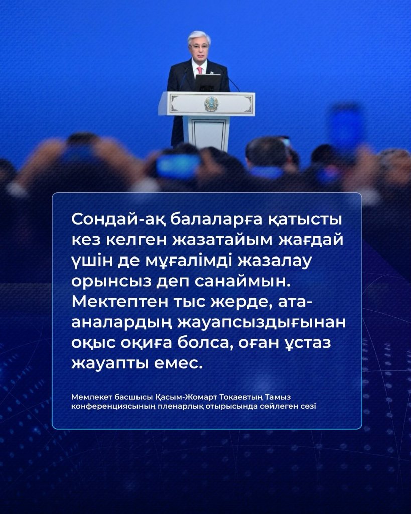 Сондай-ақ балаларға қатысты кез келген жазатайым жағдай үшін де мұғалімді жазалау орынсыз деп санаймын. Мектептен тыс жерде, ата-аналардың жауапсыздығынан оқыс оқиға болса, оған ұстаз жауапты емес. Алматы облысында түлектер арасында болған қайғылы жағдай үшін директор мен мұғалімдер жауапқа тартылып, жұмыстан шығарылды. Министрлік олардың мүддесін қорғап қалды. Дұрыс. Біз мұндай келеңсіздікке жол бермеуіміз керек.