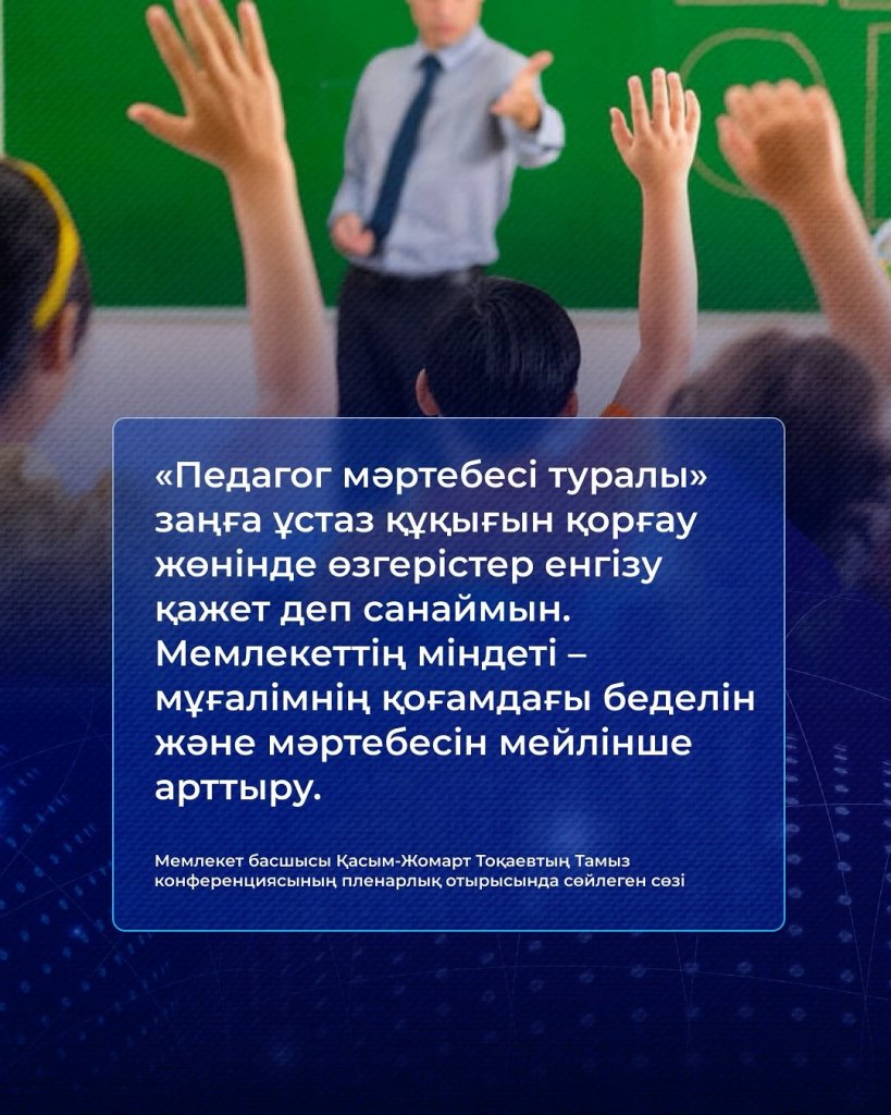 «Педагог мәртебесі туралы» заңға ұстаз құқығын қорғау жөнінде өзгерістер енгізу қажет деп санаймын.