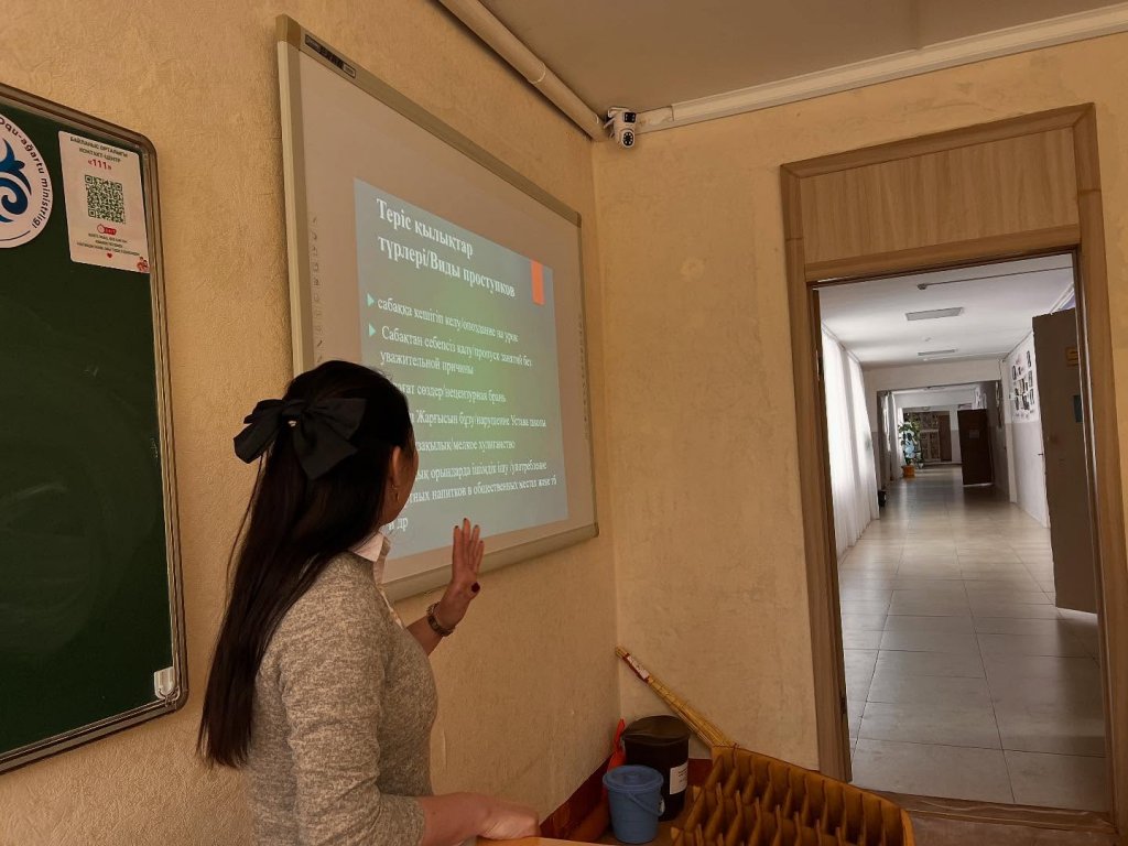 Оқушыларға жасөспірімдердің құқық тәртібін бұзуы әкімшілік жауапкершілікке әкелетінін және оның қандай салдары болуы мүмкін екенін еске салынды.