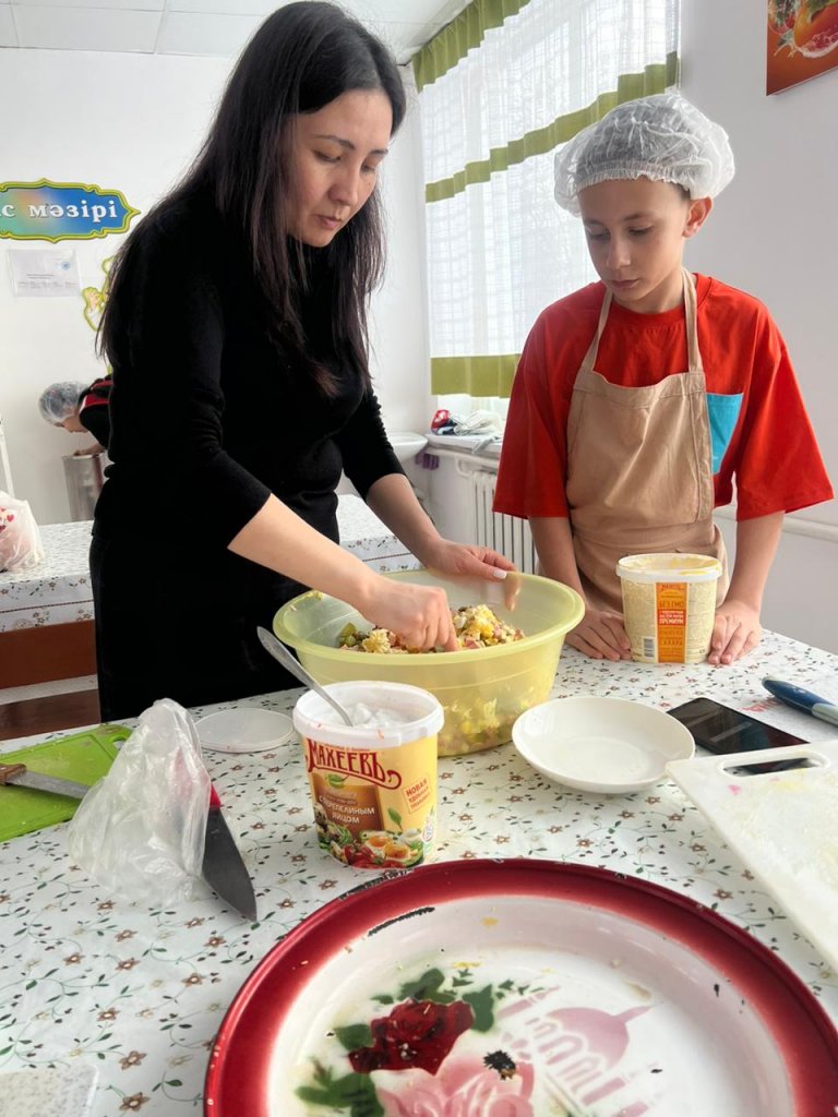 "Досболлайк" акциясына орай ұйымдастырылған аспаздық шеберлік сыныбы.6 "Б" сынып оқушылары мен аналары, мұғаліммен бірге тамақ дайындады, бір-біріне көмектесті, пісіру дағдыларын алды және жақсы әсер қалдырды.